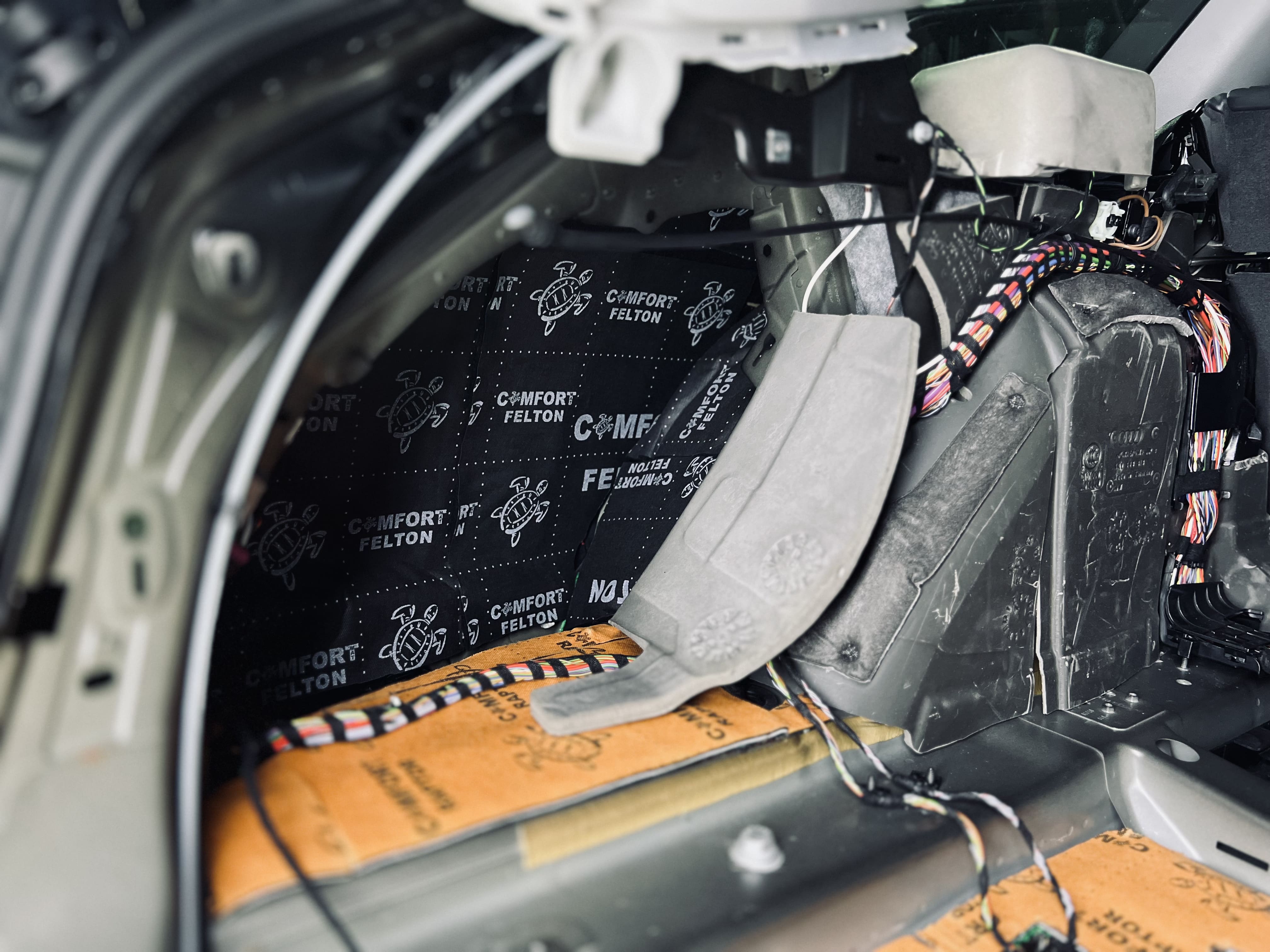 Вторым слоем на дно салона и багажник уложили Comfort Mat Raptor, а на стенки багажника – Comfort Mat Felton. На снимке видны готовые слои Raptor и Felton, обеспечивающие максимальное поглощение шума. Для закрытия швов и стыков мы использовали контурную ленту, подобранную в тон шумоизоляции, что не только повышает надежность, но и придает эстетичный вид, даже скрытый под ковровым покрытием.