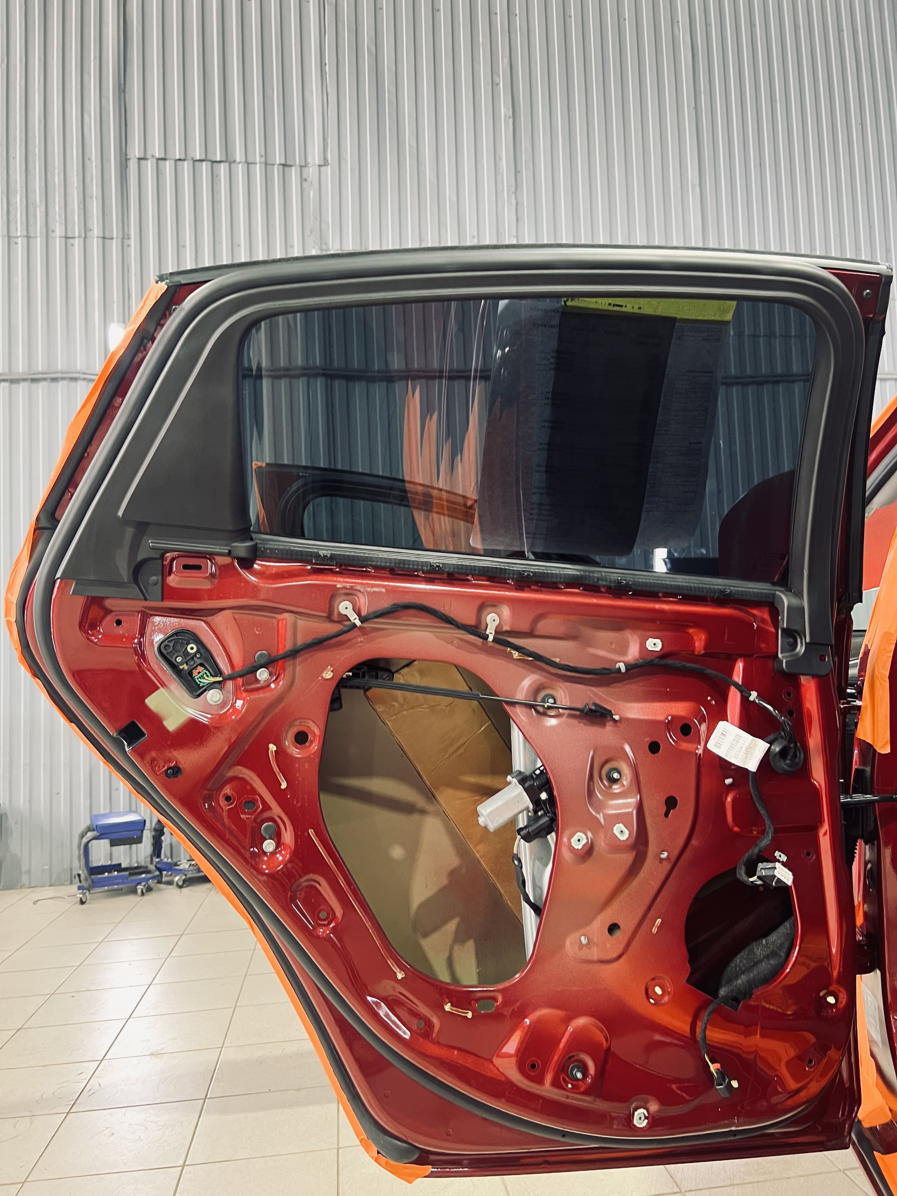 Работа началась с демонтажа дверных карт. На фото показана подготовленная дверь с чистым металлом, готовая к нанесению материалов.