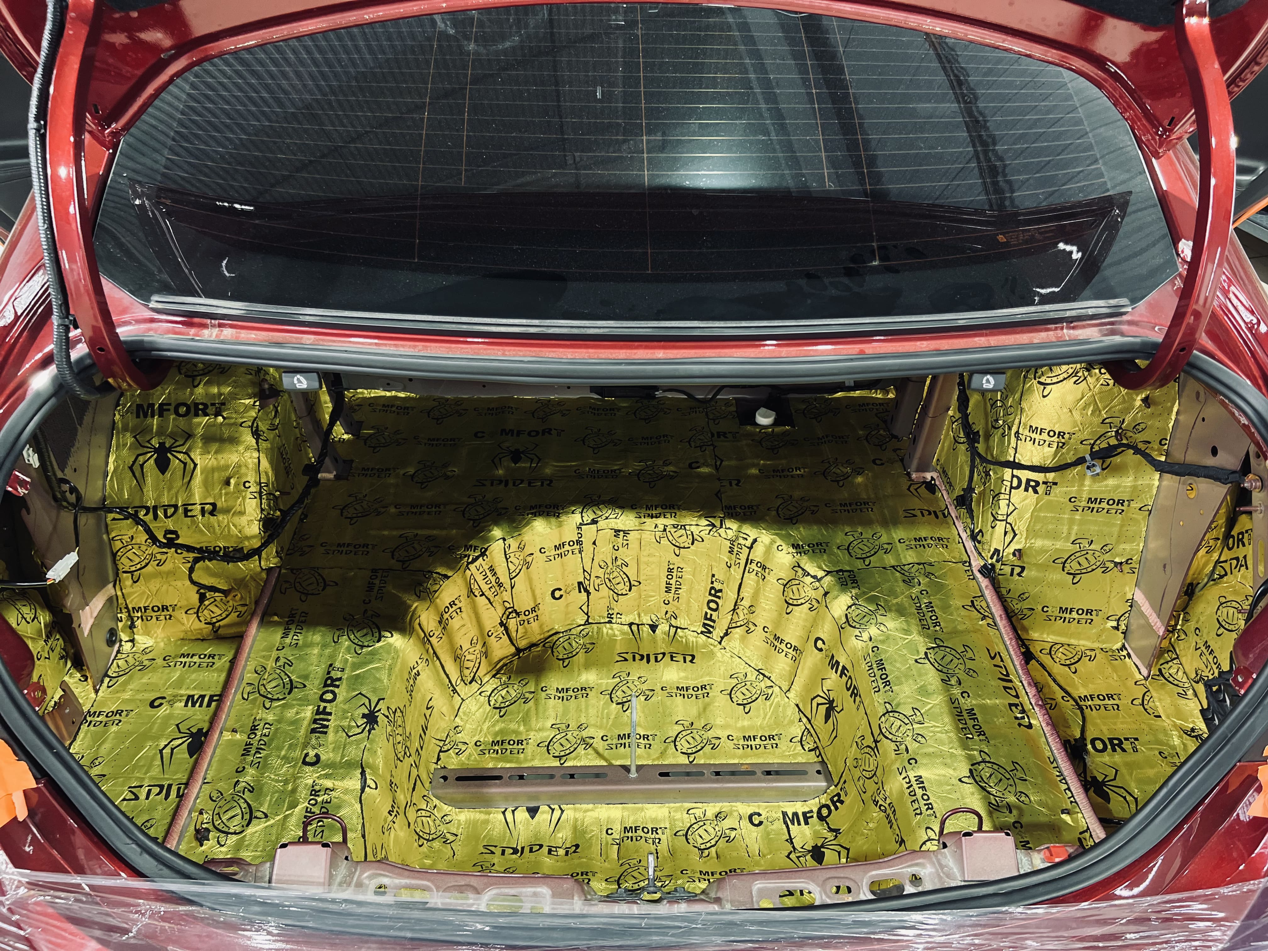 Первым слоем на днище и дно багажника нанесли виброизоляцию Comfort Mat Spider, а на стенки багажника – Comfort Mat Vespa.