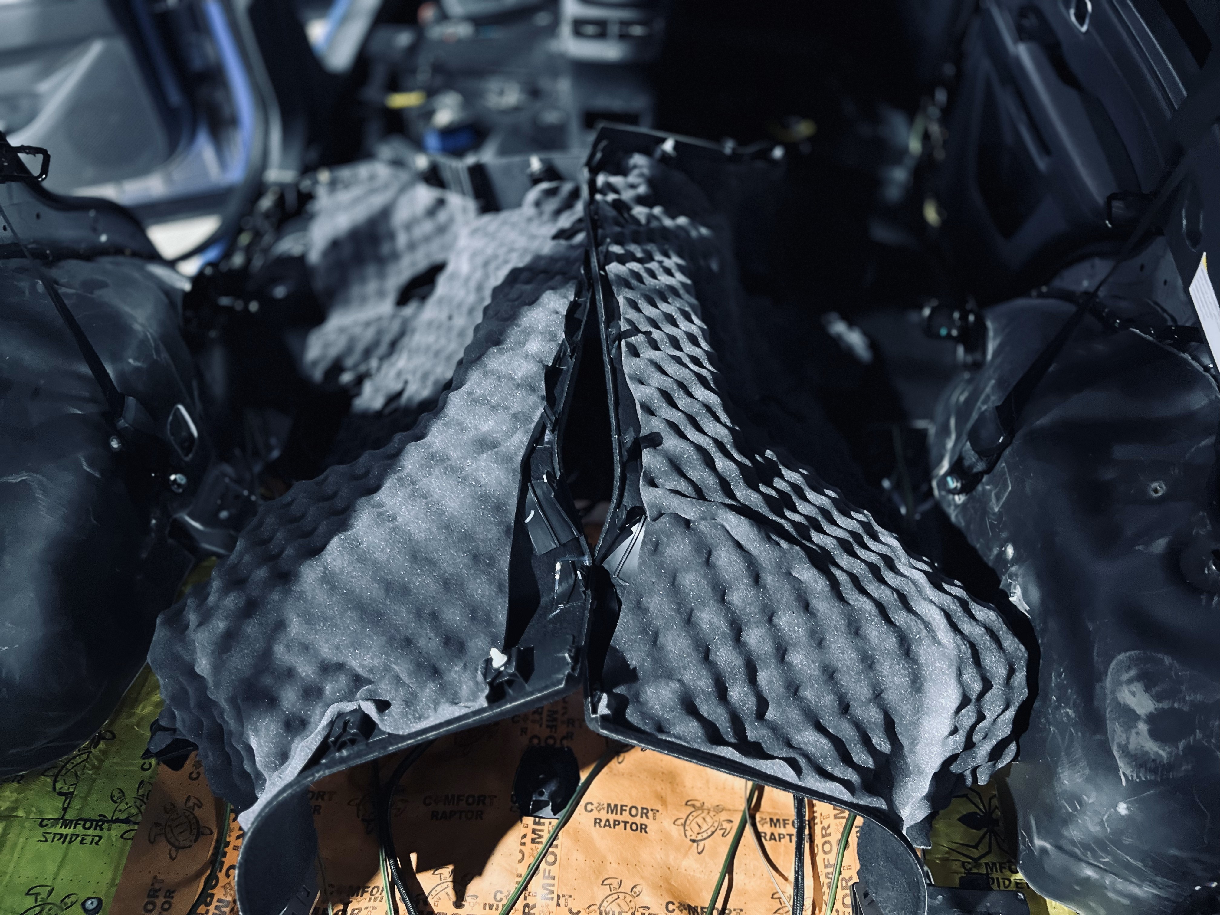 Вторым слоем применили комбинацию материалов: на полу салона – Шумоизоляция Comfort Mat BlockShot, на дне багажника – Comfort Mat Raptor.